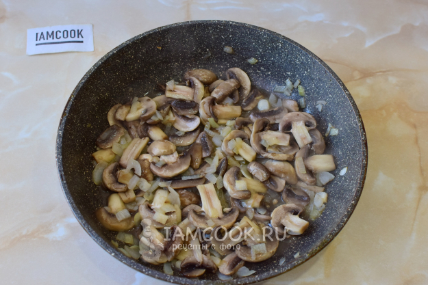 Выложите грибы в сковороду к луку. Обжаривайте все вместе еще 5-7 минут. Грибы станут мягкими и ароматными.