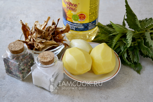 Продукты для приготовления супа с крапивой и грибами - перед вами.