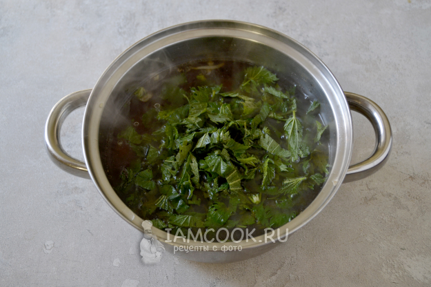 Когда картошка будет готова, положите в кастрюлю нарезанную крапиву. Доведите до кипения, уменьшите огонь и проварите суп с крапивой еще пару минут.