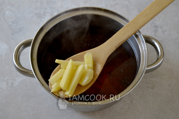 Положите в бульон нарезанный соломкой/брусочками картофель. Посолите.