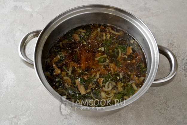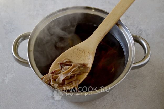 Если у вас собственноручно приготовленные сушеные грибы, в качестве которых вы уверены, то варите грибы в той воде, в которой они были замочены. В противном случае воду слейте, залейте набухшие грибы чистой водой и варите в ней. Кастрюлю с грибами поставьте на огонь, доведите до кипения и варите грибы в течение 13-15 минут. Если хотите, чтобы в супе грибы были мелкими кусочками, перед варкой нарежьте их.