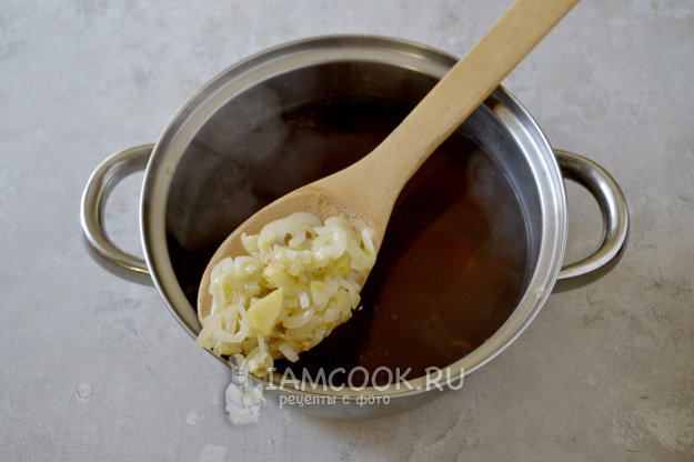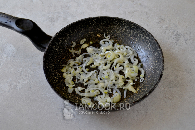 Пока картошка варится, обжарьте на растительном масле до легкого золотистого цвета нарезанный репчатый лук.