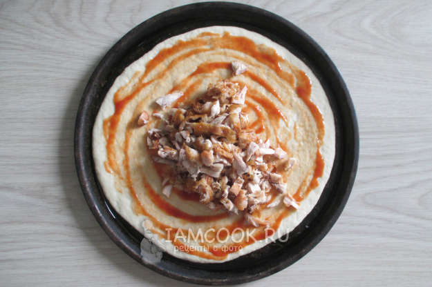 Куриное мясо для пиццы нужно уже готовое, подходит практически любое: отварное, запеченное, жареное, копченое, а также размороженные заготовки. У меня были кусочки замороженных крылышек и голеней, приготовленных по этому рецепту в аджике.