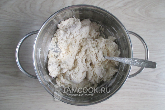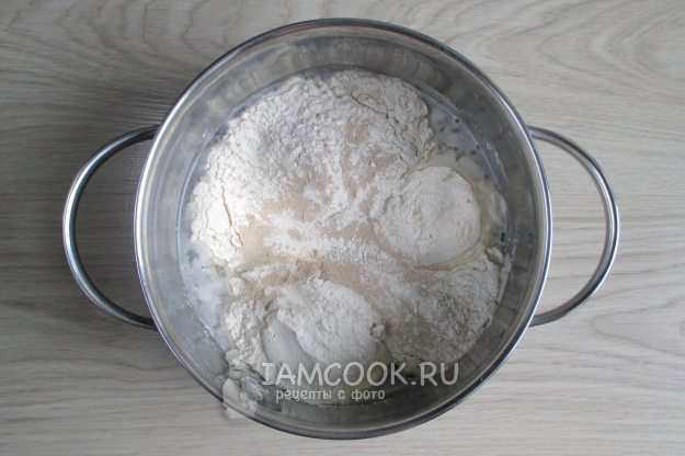Соедините между собой ингредиенты для теста в следующем порядке: воду с растительным маслом, муку с солью, сахаром и сухими дрожжами.