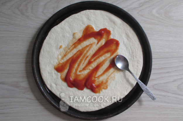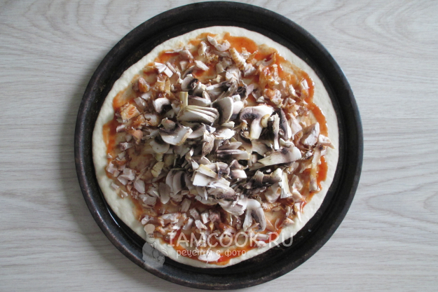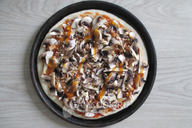 Для пиццы с сырыми шампиньонами раскатайте порцию теста в круглую тонкую лепешку. По желанию сформируйте бортики. Смажьте тесто томатным соусом.