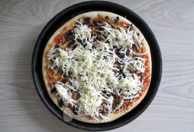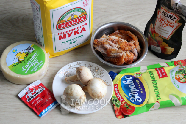 Ингредиенты для пиццы с сырыми шампиньонами подготовьте по списку к рецепту.