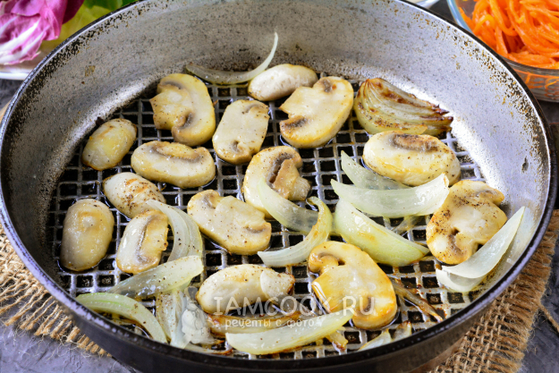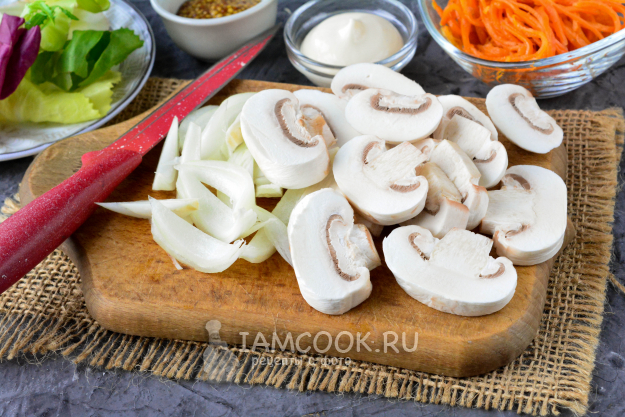 Почистите шампиньоны и репчатый лук. Грибы нарежьте пластинками, а лук - полукольцами.