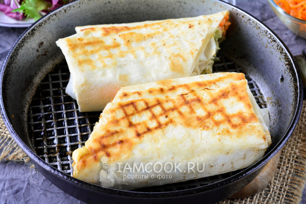 Сковороду смажьте небольшим количеством растительного масла и выложите шаурму. Обжаривайте со всех сторон до хрустящей румяной корочки буквально по 2-3 минуты. К тому же сыр расплавится после обжарки - это будет очень вкусно. У меня вся шаурма не поместилась на сковороду, поэтому я ее разрезала пополам, но так даже удобнее есть. Сковорода для обжарки может быть любой, гриль - это будет идеально.