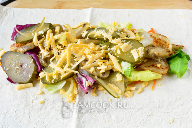 Добавьте в начинку ломтики соленых огурчиков и присыпьте всё натертым сыром.