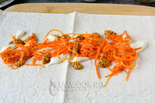 Разверните тонкий лаваш, полейте его майонезом, добавьте дижонскую горчицу и равномерно распределите корейскую морковь.