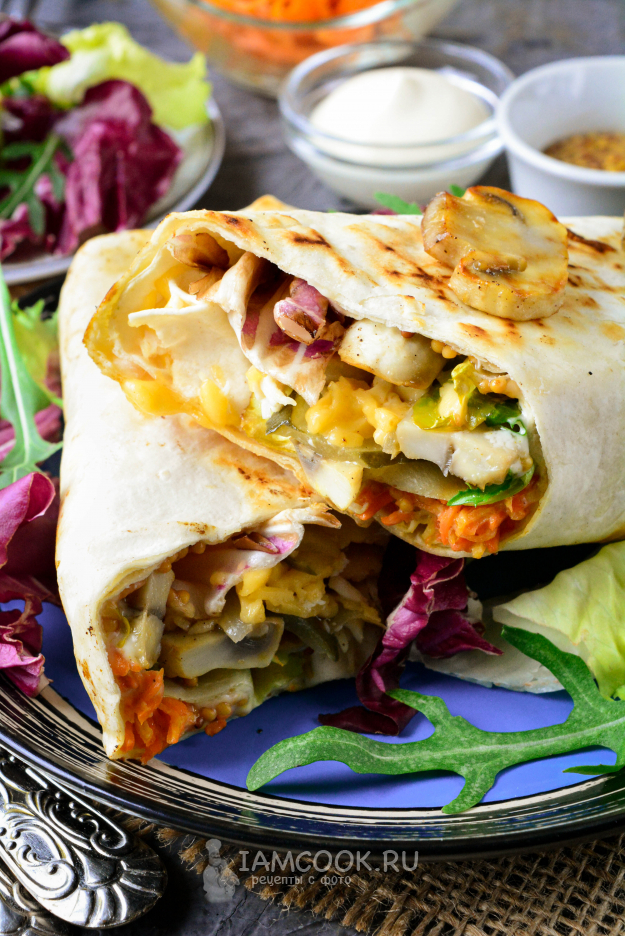 Готовую горячую шаурму с грибами (шампиньонами) сразу подавайте к столу. Думаю, такой вариант популярной закуски найдет своих поклонников. Приятного вам аппетита!