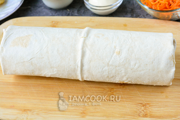 Лаваш сверните рулетом, подворачивая сбоку все края - так начинка не будет выпадать из шаурмы.