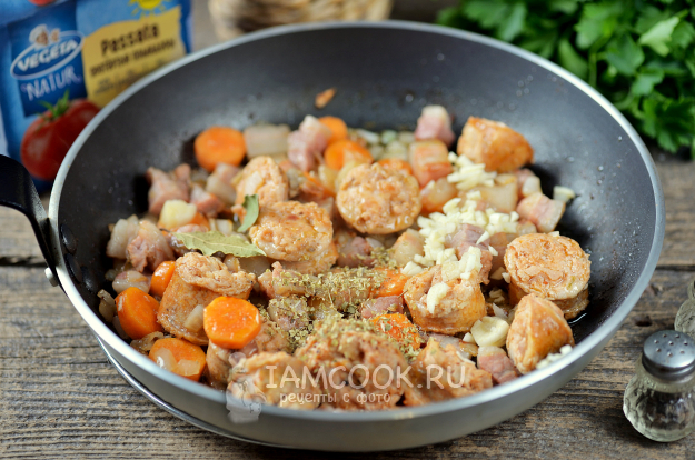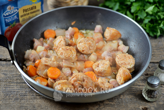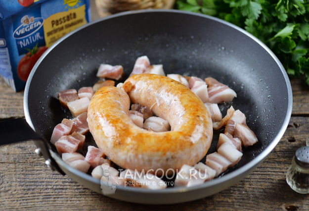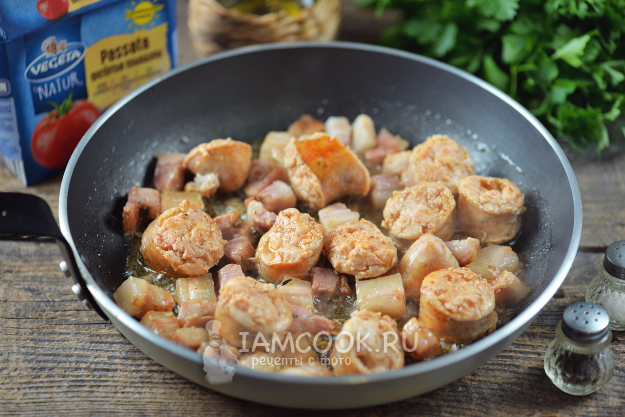 Нарежьте свиную грудинку небольшим кубиком, обжарьте вместе с колбаской до румяного цвета в небольшом количестве растительного масла.