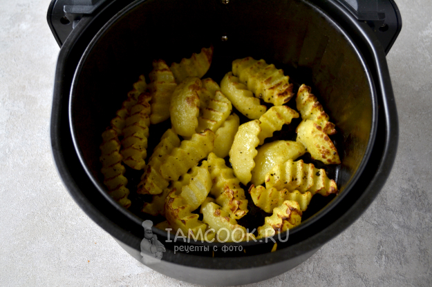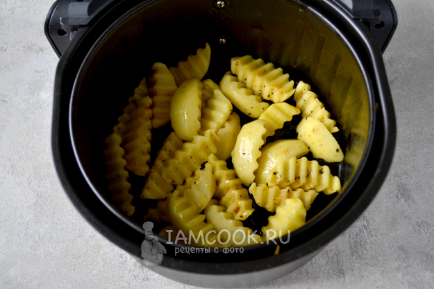 Прогрейте аэрогриль в течение 10 минут при температуре 200°С. В специальную чашу аэрогриля положите подготовленные ломтики картофеля.