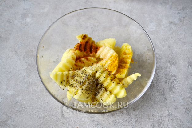 Посыпьте картошку солью и специями.