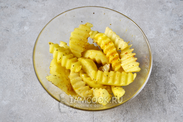 Тщательно перемешайте картошку со специями и солью. Затем полейте растительным маслом и еще раз перемешайте. Оставьте картофель на несколько минут, чтобы успел пропитаться ароматами.