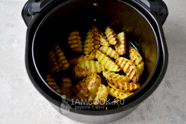 После 20 минут в аэрогриле картошка по-деревенски готова. Если ломтики картофеля будут более крупными, времени на приготовление может понадобиться немного больше. Растительное масло осталось в поддоне перфорированной чаши. Картошка получилась с аппетитной поджаристой корочкой и очень мягкой, нежной внутри.