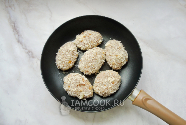 Из фарша сформируйте котлеты и обваляйте в панировочных сухарях или, как я, в хлебных крошках. Выложите на горячую сковороду с растительным маслом.