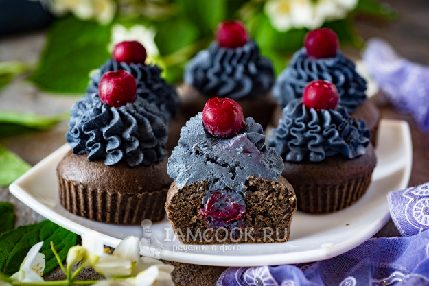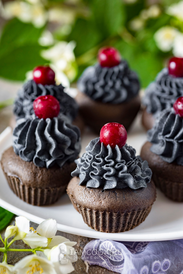 Готовым черным кремом заполним кондитерский мешок с насадкой звездочка и отсадим кремовые шапочки на черные капкейки с вишенками. Готовые капкейки подаем к столу.