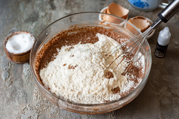 Перемешаем всё лопаткой до полного распределения красителя по тесту.
