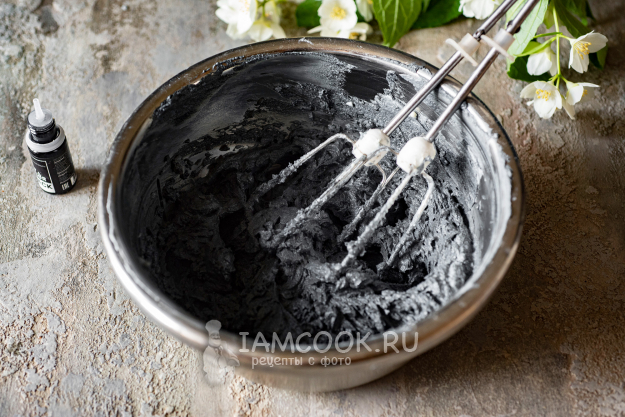 Миксером будем взбивать эти ингредиенты до получения однородного крема, к которому добавим несколько капель черного красителя.