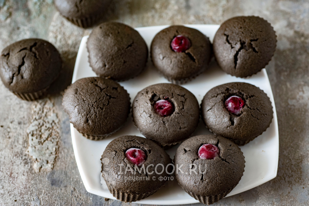 Готовые капкейки полностью охладим. Вырежем в каждом капкейке небольшую выемку, которую можно заполнить любым наполнителем, например, джемом или кремом. Я поместила в каждую выемку капкейка по вишенке (замороженной, без косточки).