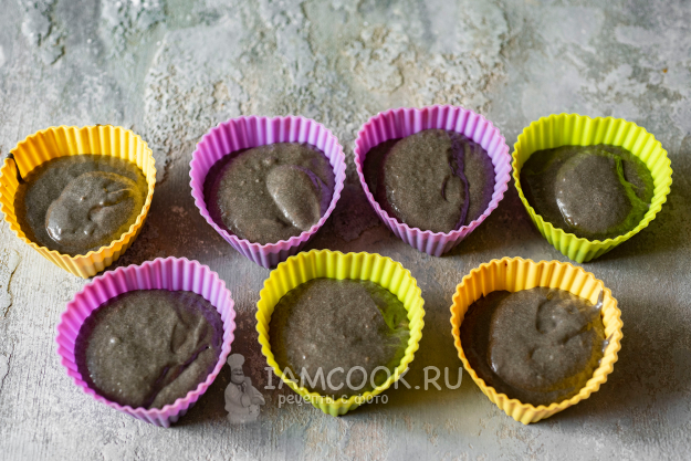 Я использую для выпекания силиконовые формочки, которые заполняю черным тестом на 2/3 от объема. Выпекаем черные капкейки 20-25 минут в уже разогретой до 180 градусов в духовке.