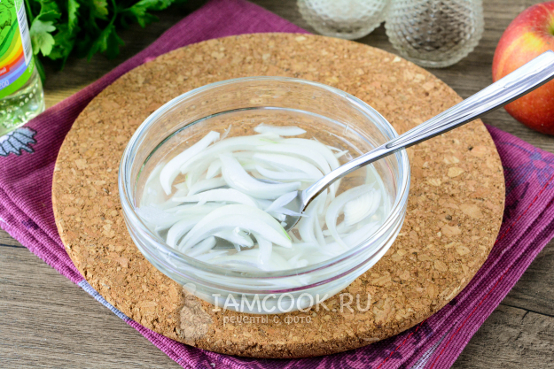 Репчатый лук почистите и нарежьте полукольцами. Залейте лук 150 г воды комнатной температуры и добавьте яблочный уксус. Перемешайте и оставьте мариноваться на 15 минут. Затем всю жидкость слейте.