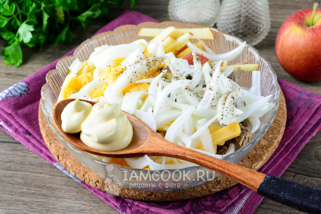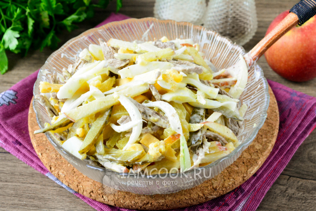Смешайте отварную говядину, нарезанные яблоки, соленые огурцы и твердый сыр.