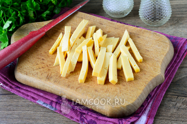 Нарежьте соломкой твердый сыр. Возьмите любой, который вам нравится.