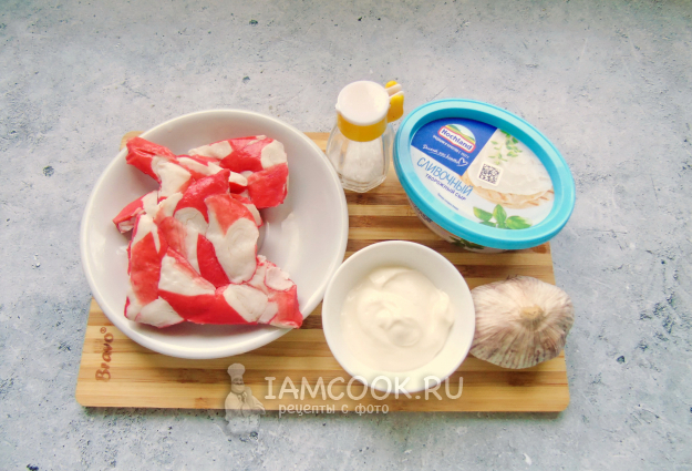 Соберите все ингредиенты для приготовления крабового крема из крабовых палочек или крабового мяса.