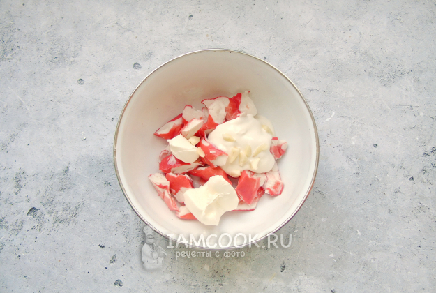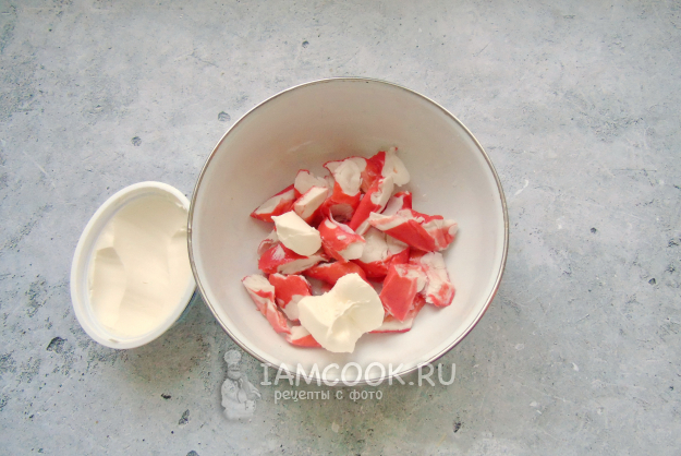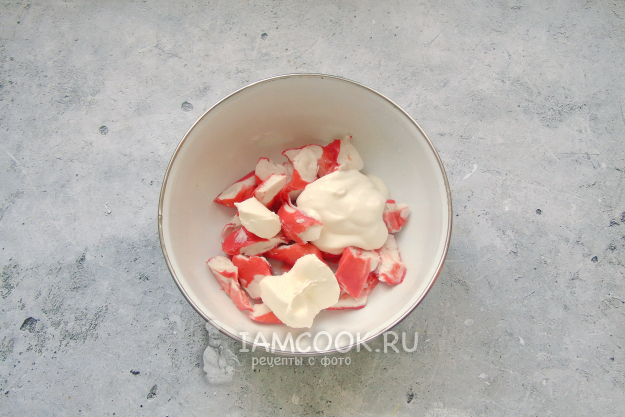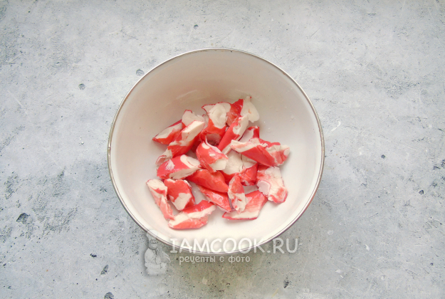 В миску выложите крабовые палочки.
