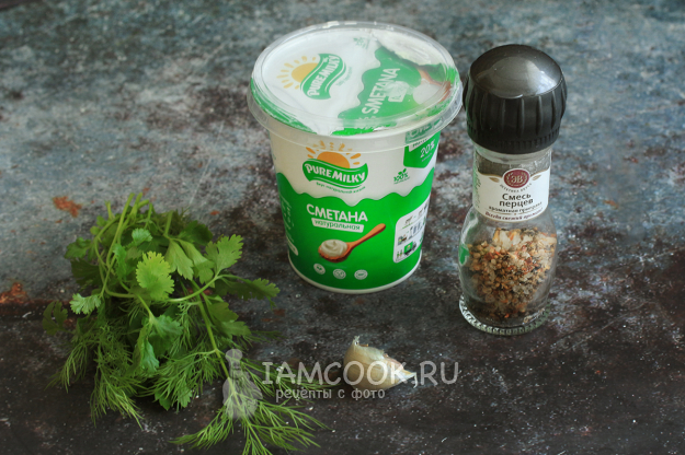 К горячим кабачковым блинам приготовьте сметанно-чесночный соус. Все, что для этого потребуется - перед вами на фото.