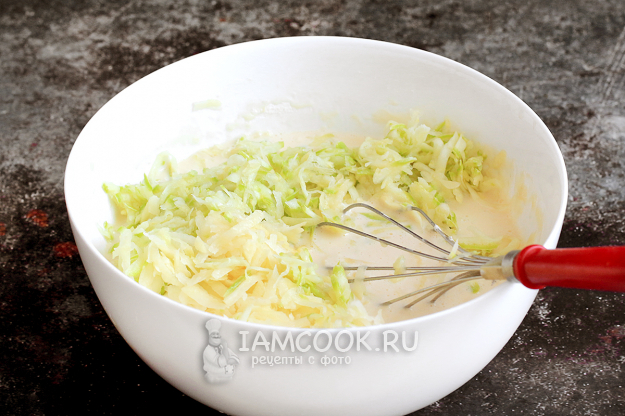 Молодой кабачок вымойте и натрите на крупной терке. Картофель очистите от кожуры и тоже натрите на терке. Хорошенько отожмите всю жидкость из картофеля и кабачка. Добавьте овощи в тесто и перемешайте.