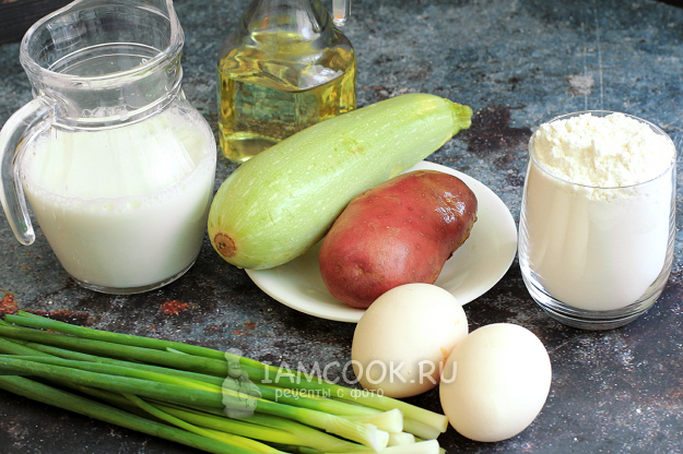 Для приготовления кабачковых блинов на молоке (с картошкой) соберите необходимые продукты по списку. Я использовала очень крупные яйца (оба весят 150 г), поэтому взяла два, а обычных яиц нужно три штуки.