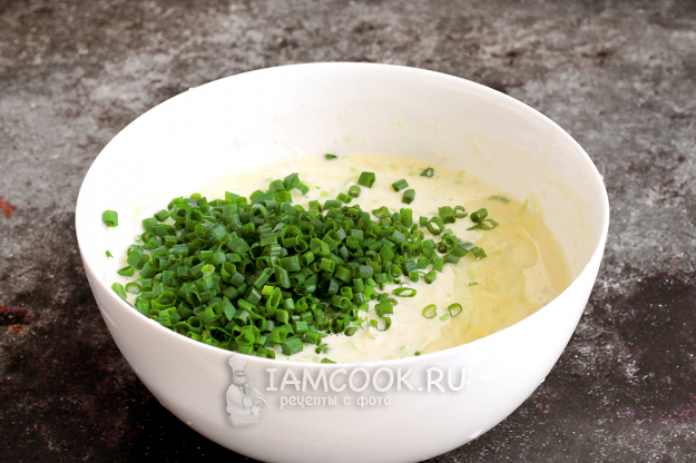 Зеленый лук нарежьте мелко и добавьте в тесто. Влейте растительное масло. Перемешайте, чтобы получилось тесто чуть жиже, чем на оладьи.