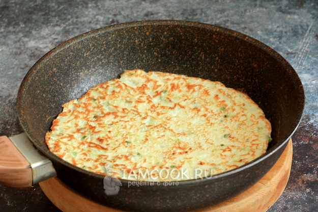Обжарьте блины с одной стороны не менее 2-3 минут. Время зависит от степени нагрева вашей плиты. Если вы видите, что низ уже зарумянился, то переверните блин на другую сторону. Можно сковороду накрывать крышкой, чтобы все составляющие гарантированно приготовились. Огонь держите ниже среднего.