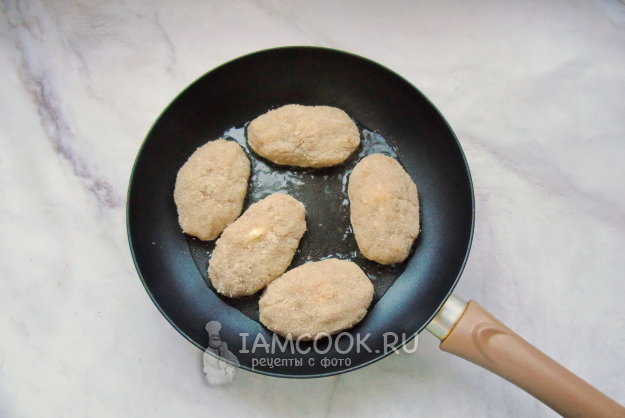 На горячую сковороду с подсолнечным маслом выложите котлеты и жарьте их на среднем огне с одной стороны до золотистой корочки. После переверните котлеты на другую сторону, огонь немного убавьте, накройте сковороду крышкой и доведите котлеты до готовности.