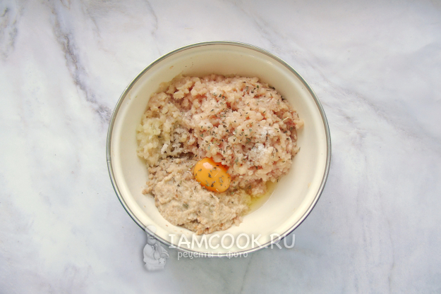 Добавьте яйцо, соль, перец и любые сухие приправы по вкусу.