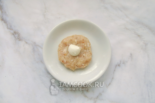 Хорошо перемешайте фарш до однородной консистенции. Шарики моцареллы разрежьте на две части. Из порции фарша сформируйте лепешку, на середину которой выложите кусочек сыра.