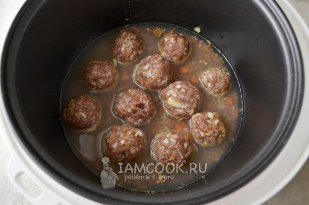 Влейте в чашу теплую воду и посолите. Закройте крышку, установите режим "Тушение" или "Крупа" и готовьте гречку с фрикадельками в мультиварке 40-45 минут.