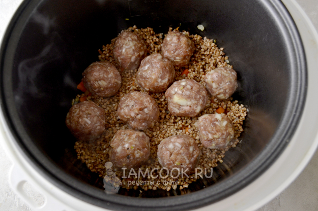 Положите на крупу подготовленные фрикадельки.