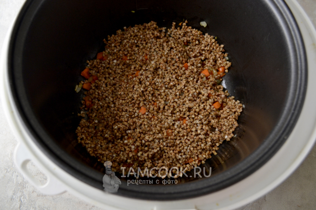 Всыпьте в чашу промытую гречневую крупу.