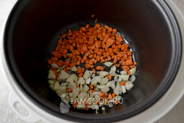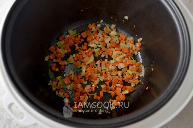 Включите режим "Жарка" на мультиварке и положите нарезанные мелким кубиком лук и морковь.