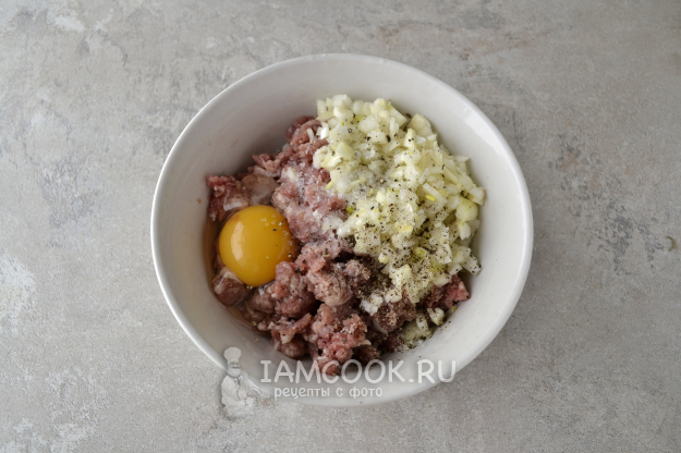 В миску с фаршем положите мелко нарезанный лук, соль, перец и разбейте яйцо.