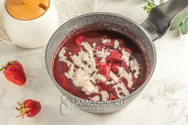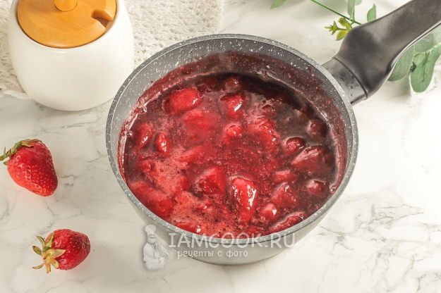 Поместите емкость с клубникой на плиту и включите умеренный нагрев. Проварите в течение 10 минут. Затем всыпьте агар-агар и вмешайте его в варенье. Проварите еще 3-4 минуты.