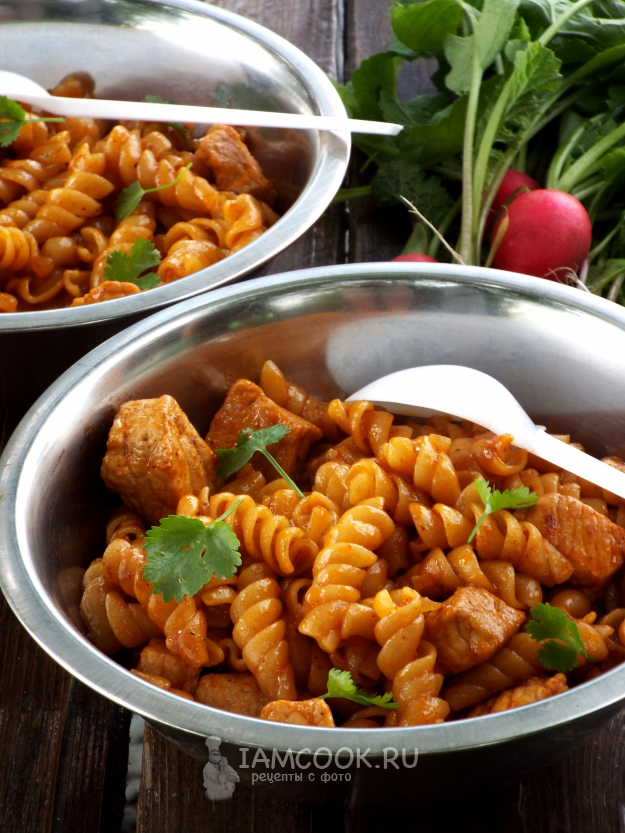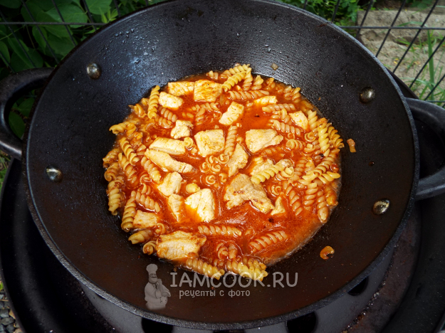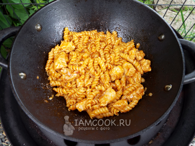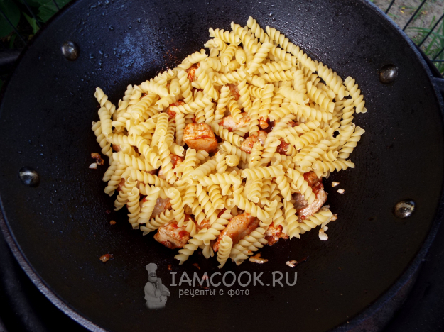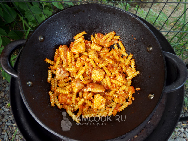 Макароны с мясом в казане на костре готовы.