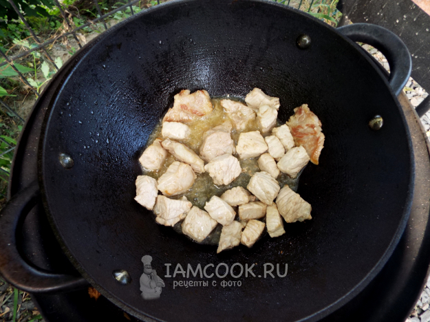 В казане накалить масло, выложить мясо.
