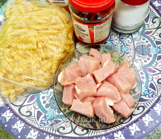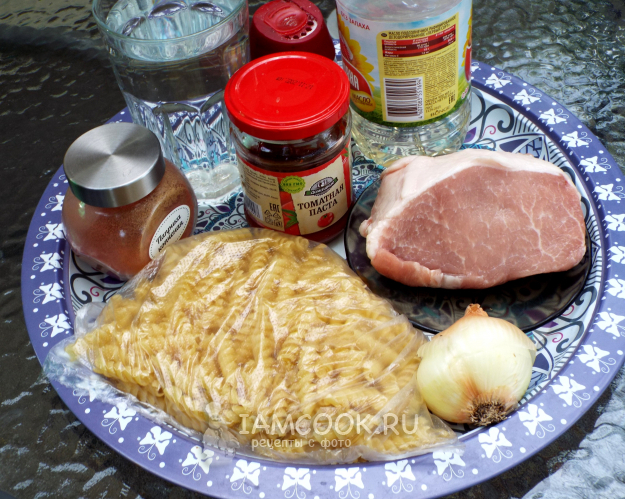 Макароны с мясом в казане на костре готовить будем из такого набора продуктов.