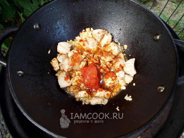 Добавить в казан паприку, томатную пасту и соль по вкусу. Перемешать.